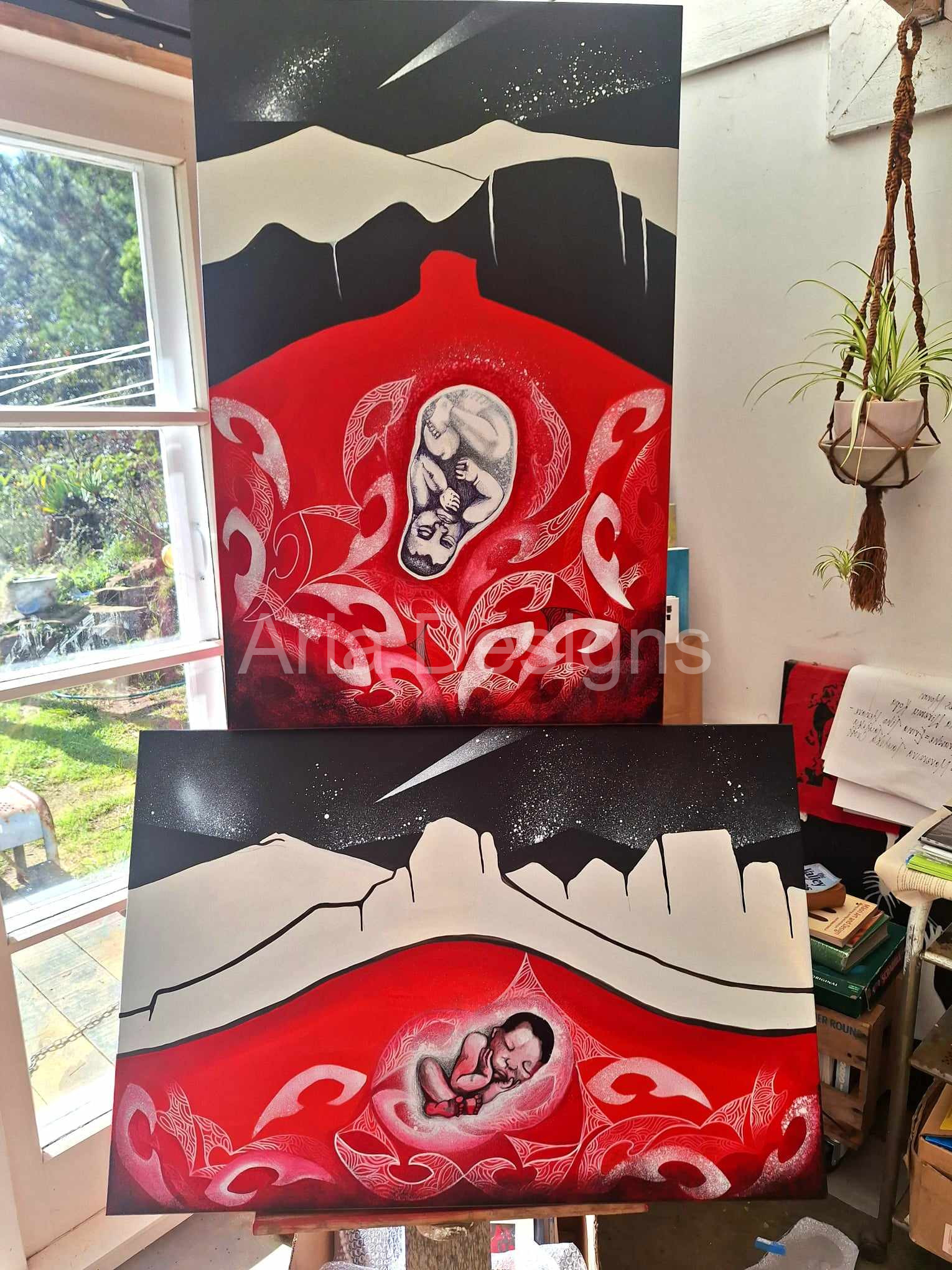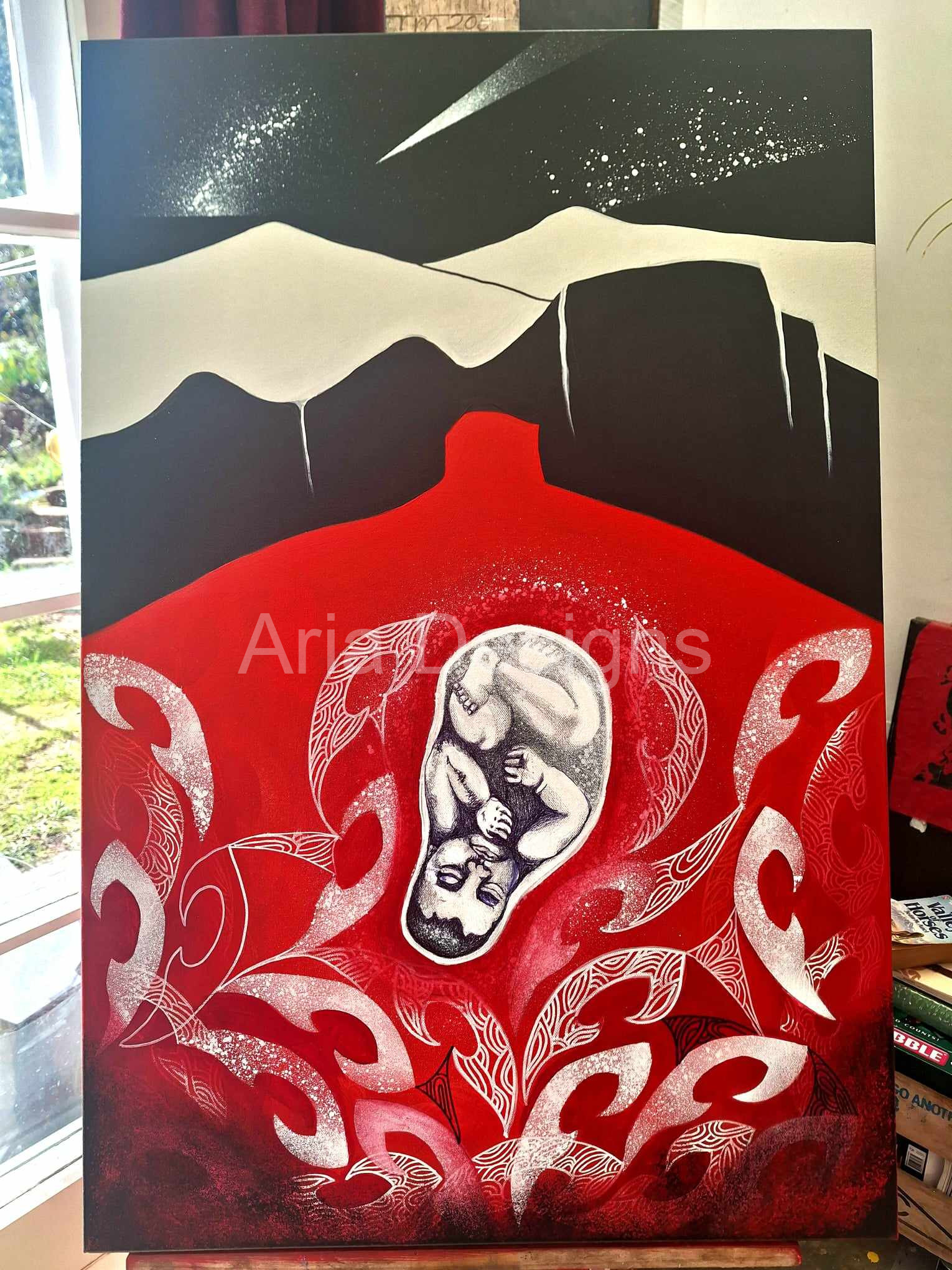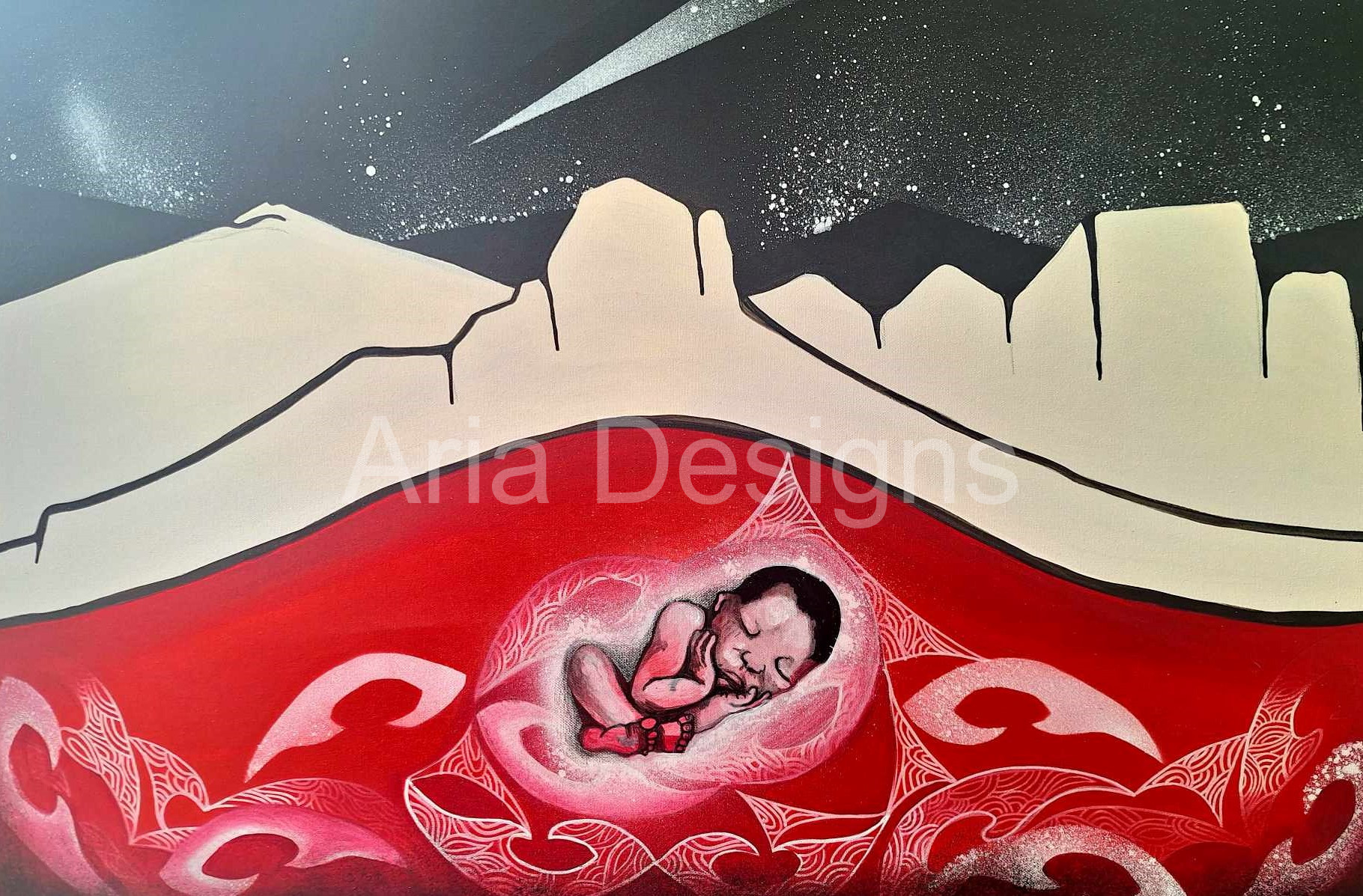 Represented here is Mana wahine: the holders of whenua, and the divine womb – Te Whare Tangata.