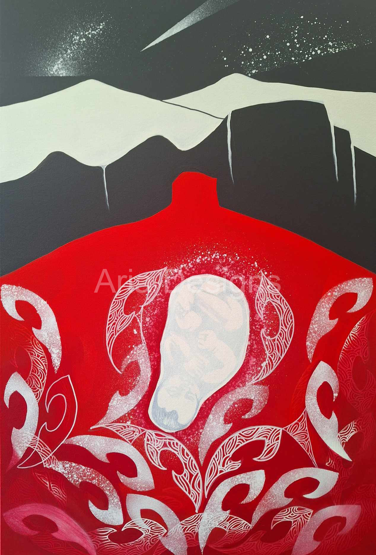 Our maunga are internal GPS locators – Ohakiri overlooks Whangaroa harbour, Emiemi overlooks Pupuke and Taratara at Otangaroa – they connect me to the past. The comet, a sign of the times, a connection to the present, and again the foetus – a symbol of the future.
