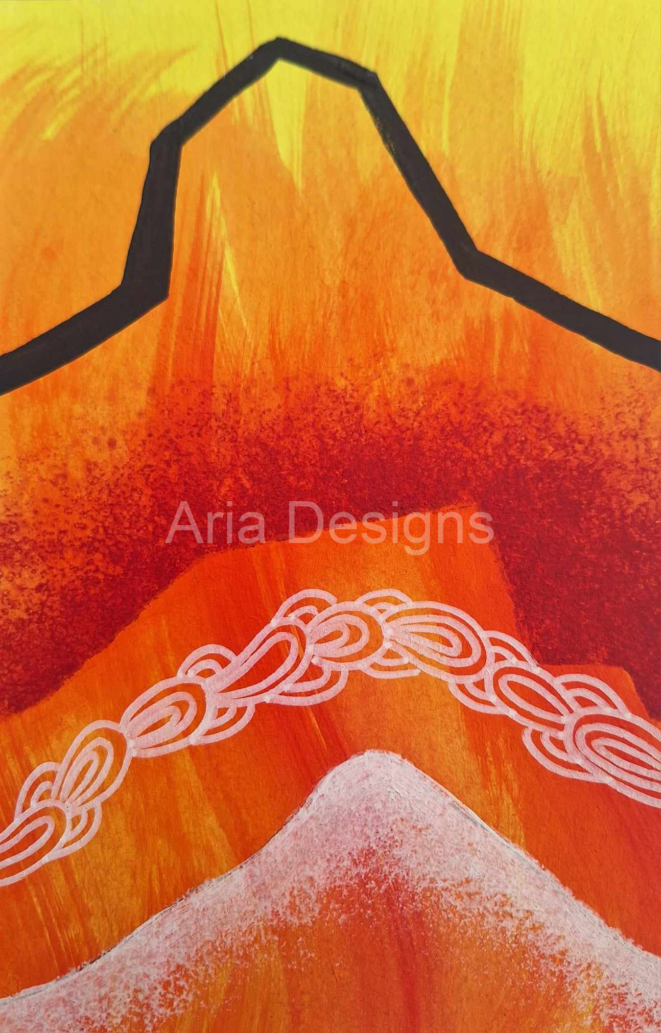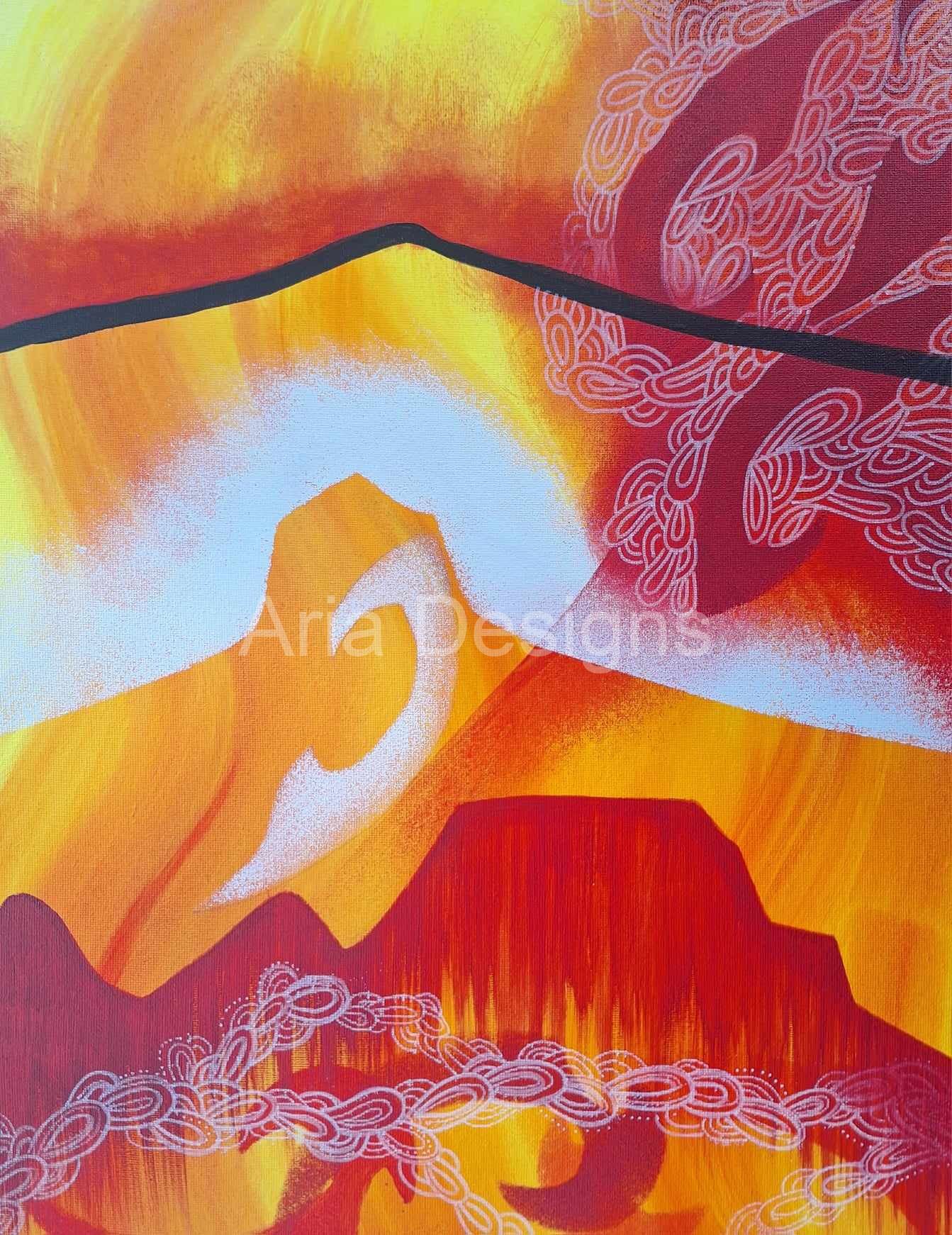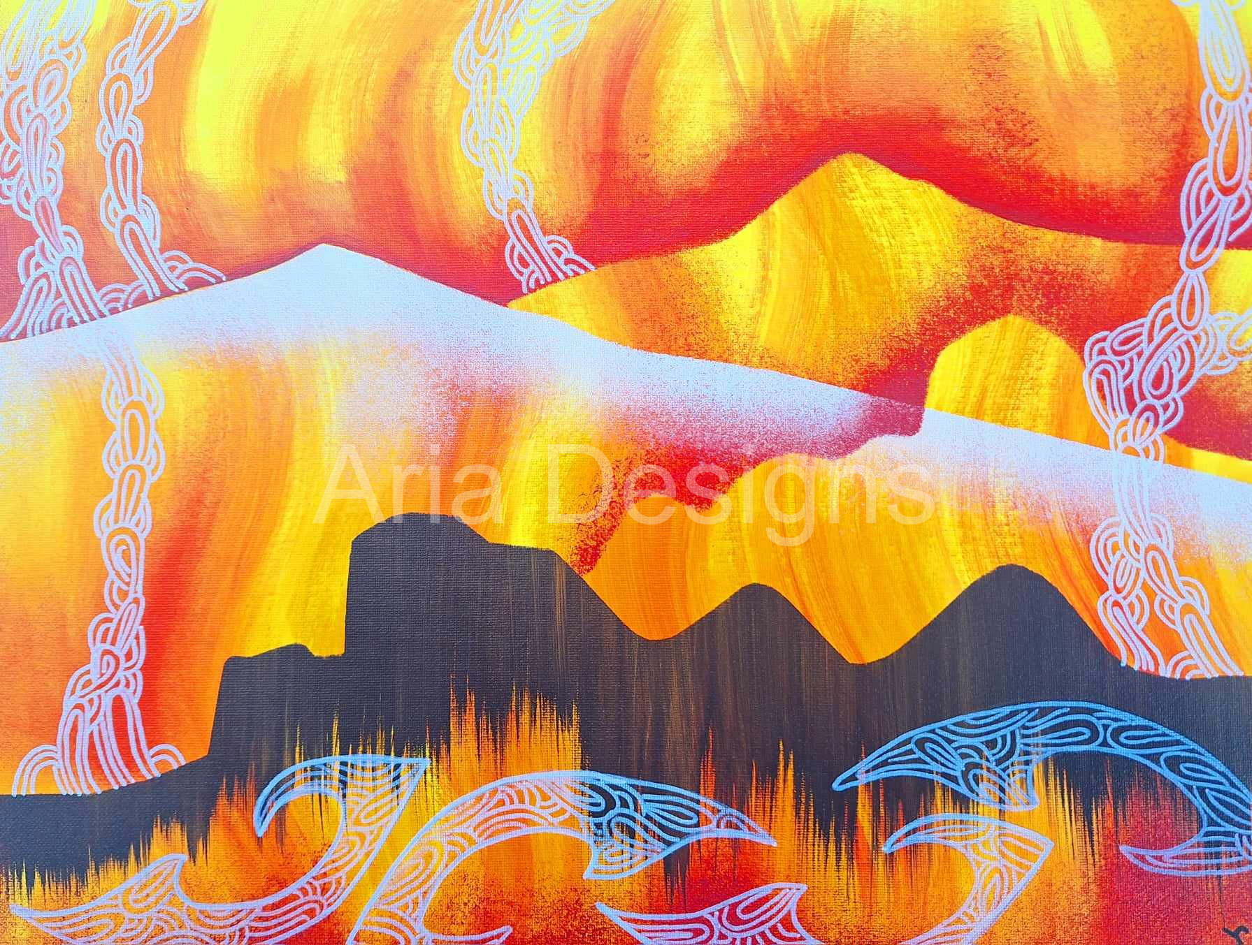 Tangata whenua describe a long passing of time before the land cooled and settled. According to their accounts the first life form to crawl up and out of the cracks of the whenua were the Tuatara and Mokomoko (lizards). They are represented in this painting in manaia form, rising from their primeval slumber to populate the whenua.