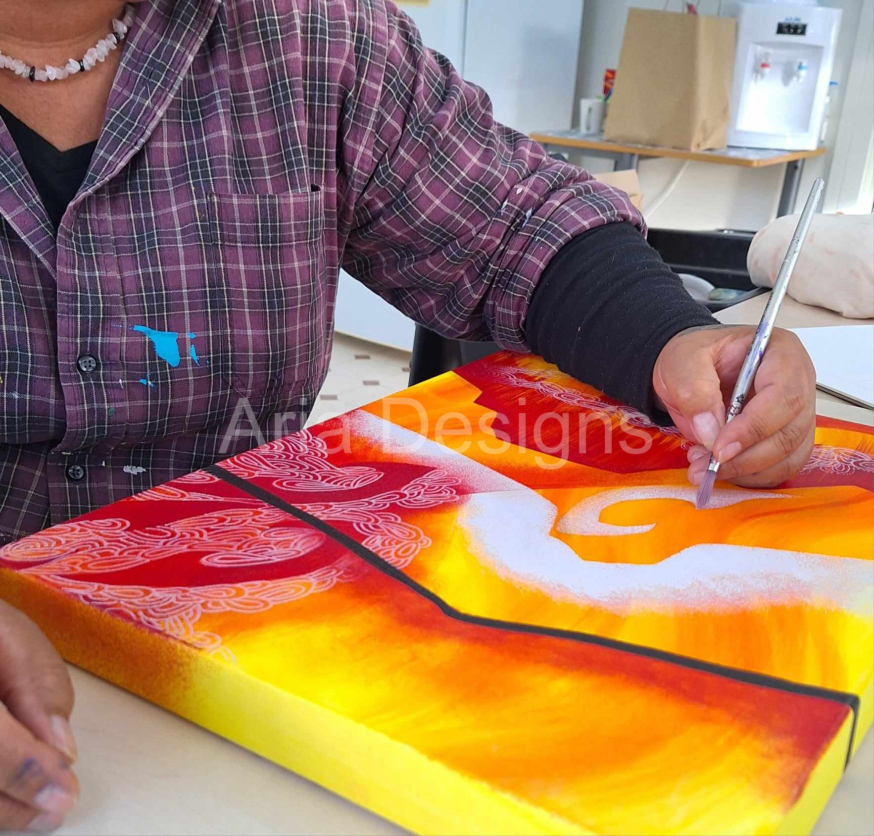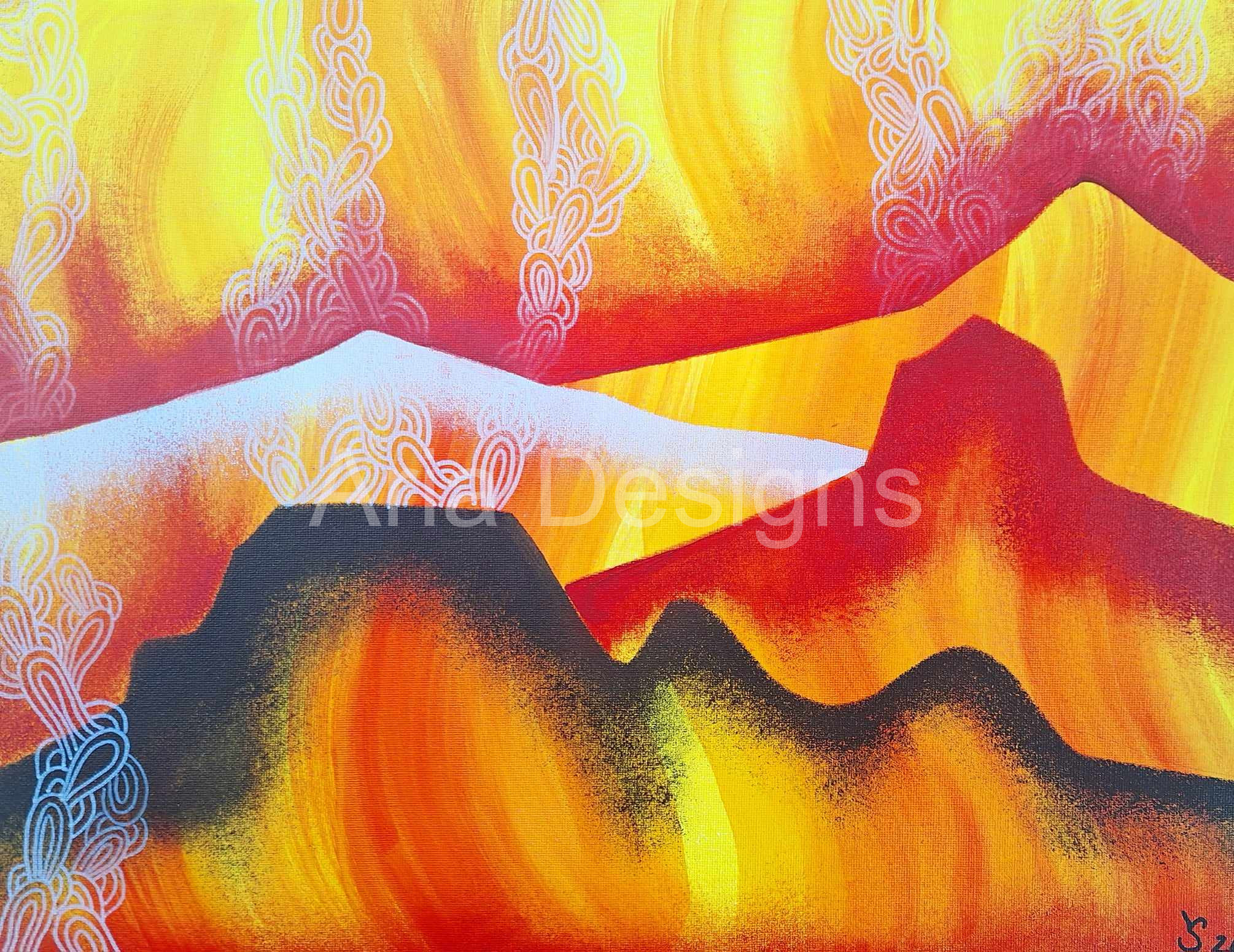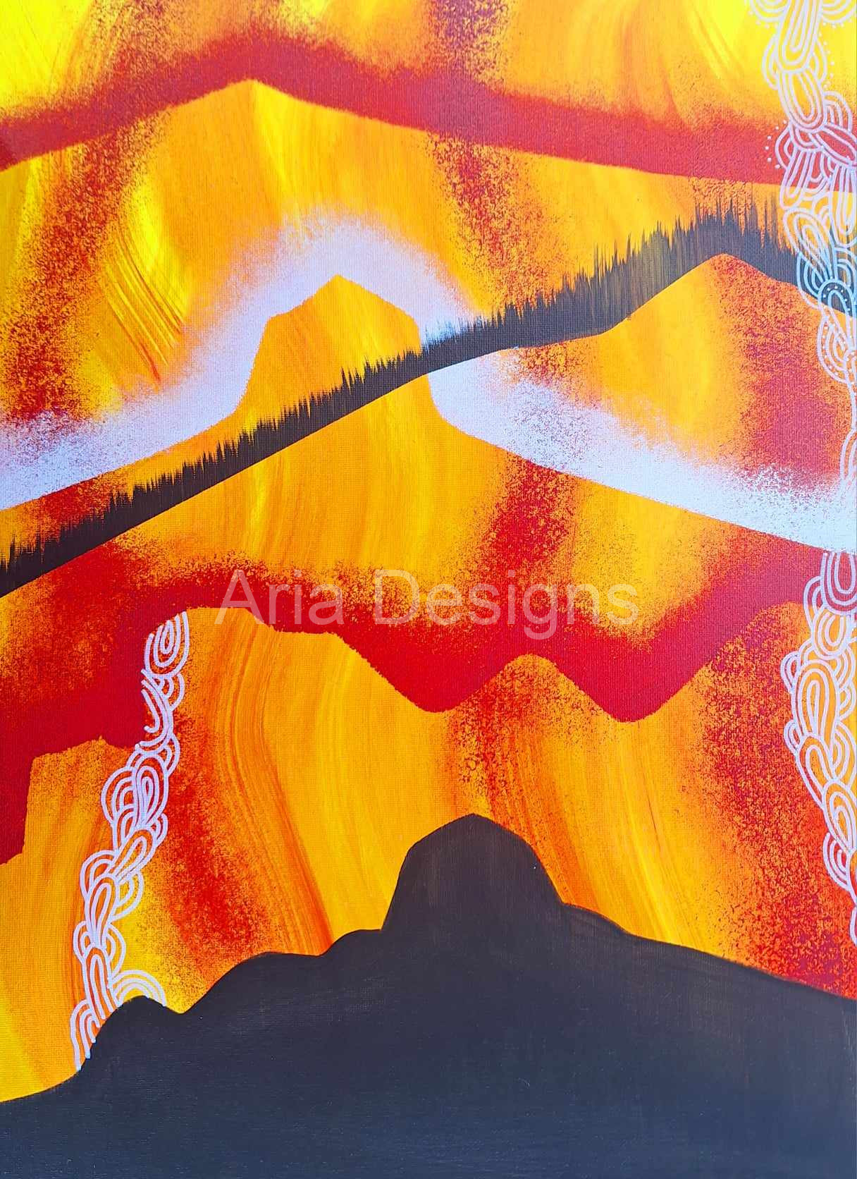 Tangata whenua describe a long passing of time before the land cooled and settled. According to their accounts the first life form to crawl up and out of the cracks of the whenua were the Tuatara and Mokomoko (lizards). They are represented in this painting in manaia form, rising from their primeval slumber to populate the whenua.
